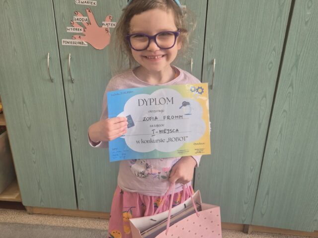 Zosia Fromm z grupy Jeżyki zajęła I miejsce w konkursie „ROBOT” organizowanym przez przedszkole nr 2 w Tucholi . Gratulujemy!