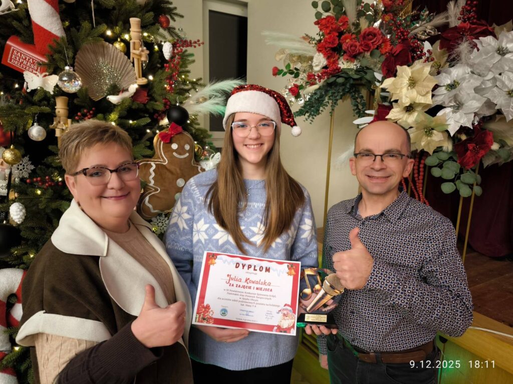 Z ogromną radością informujemy, że Julia Kowalska z klasy 8 zdobyła I miejsce w IX Powiatowym Konkursie Śpiewania Kolęd, Pastorałek oraz Piosenek Świątecznych w Językach Obcych!