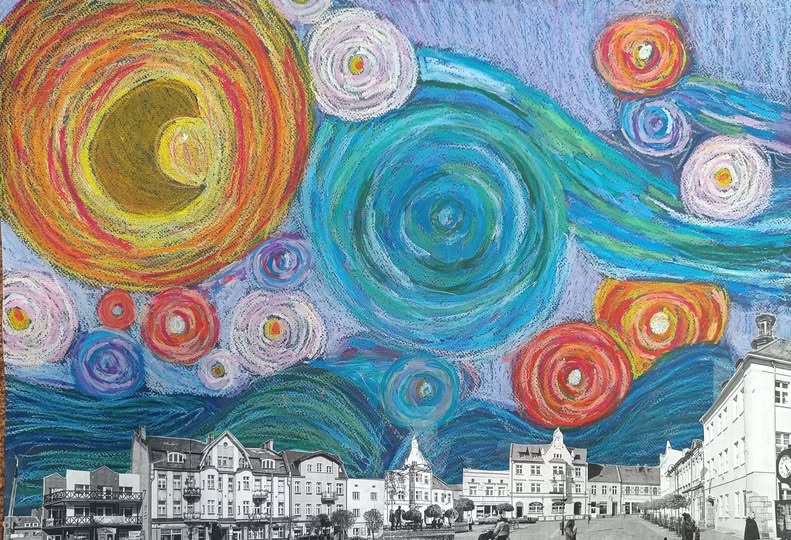Oliwia przedstawiła gwiaździście niebo Van Gogha nad Tucholą. Technika: pastele + kolaż. Format A2
